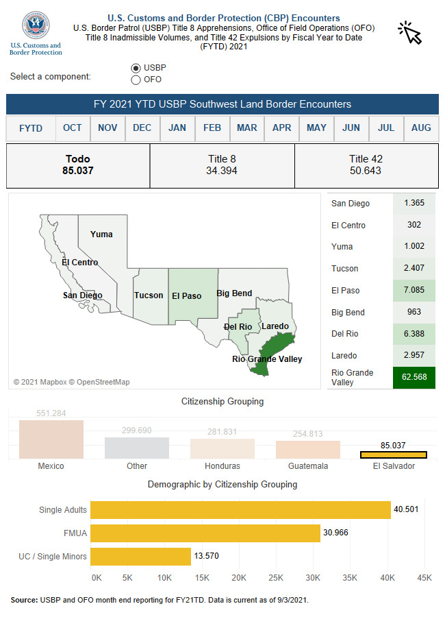 En el inventario de 2021 un poco más de 1,541,651 personas migrantes de México y Centroamérica consiguieron sumar en las estadísticas reportadas hasta agosto por las oficinas de Control de Aduanas y Protección de Fronteras (USBP) y la de de Operaciones de Campo (OFO), que con la deuda de un mes de reportes anticipan que será el año de una profunda crisis migratoria, significativamente mucho mayor que en 2019 cuando se estableció un precedente con 977,509 detenciones de personas que cruzaron de forma irregular la frontera entre México y Estados Unidos.