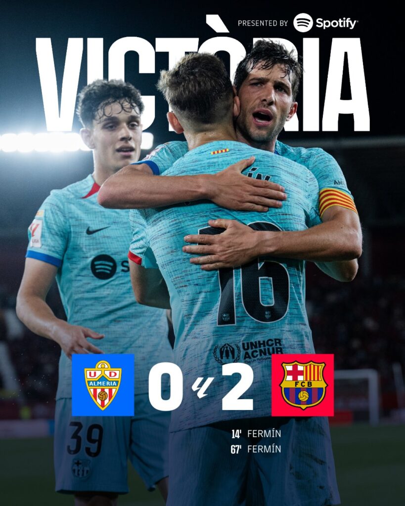 El FC Barcelona dio un gran paso hacia el subcampeonato en la Liga española al ganar 2 a 0 en su visita al colista y ya condenado Almería, este jueves en la 36ª jornada.