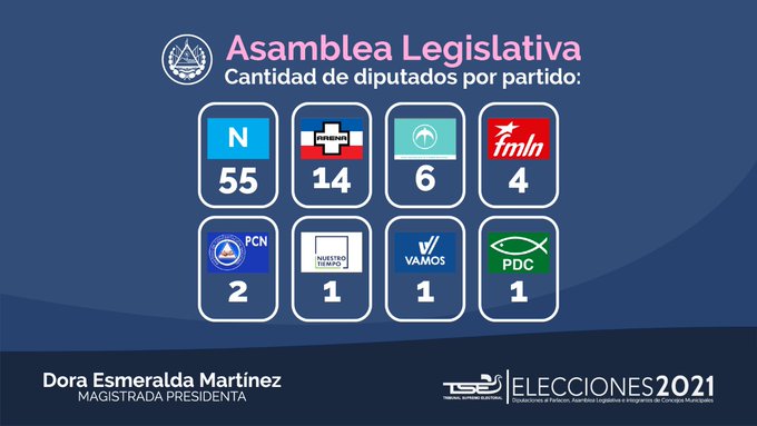 El presidente de la República, Nayib Bukele, escribió en su cuenta de Twitter que el partido Nuevas Ideas (NI) solo más la coalición tendría 56 diputados (mayoría calificada) tras la publicación de los resultados oficiales del Tribunal Supremo Electoral (TSE) que señalan que NI tendrá 55 diputados en la Asamblea Legislativa.
