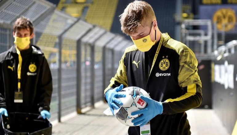 Desinfección del balón antes del partido de fútbol de la Bundesliga alemana entre el Borussia Dortmund y el Schalke 04. /EFE