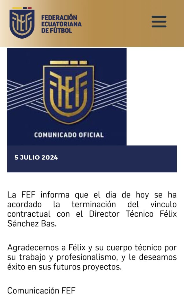 «El día de hoy se ha acordado la terminación del vínculo contractual con el director técnico Félix Sánchez Bas», informó la federación ecuatoriana en un escueto comunicado.