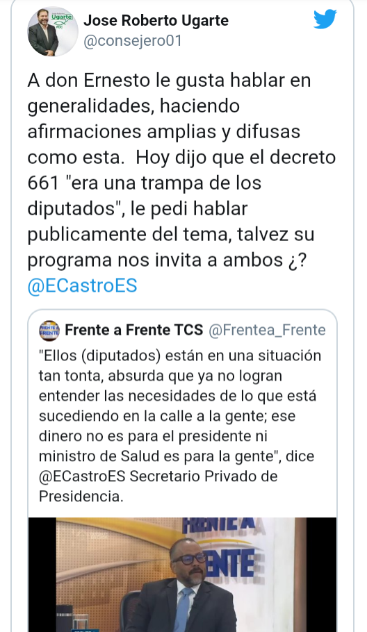 ¨A don Ernesto le gusta hablar en generalidades, haciendo afirmaciones amplias y difusas como esta. Hoy dijo que el decreto 661 “era una trampa de los diputados”, le pedi hablar publicamente del tema, talvez su programa nos invita a ambos ¿? @ECastroES