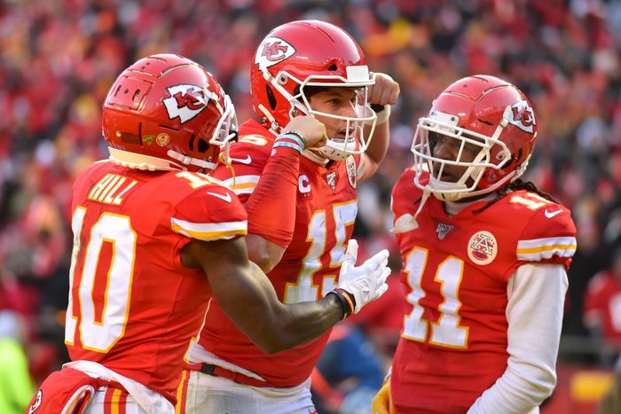 Mahomes completó 25 de 35 pases para 294 yardas con tres envíos de anotación y corrió para otra, no cedió ninguna interceptación y fue derribado dos veces dentro de la zona de protección.