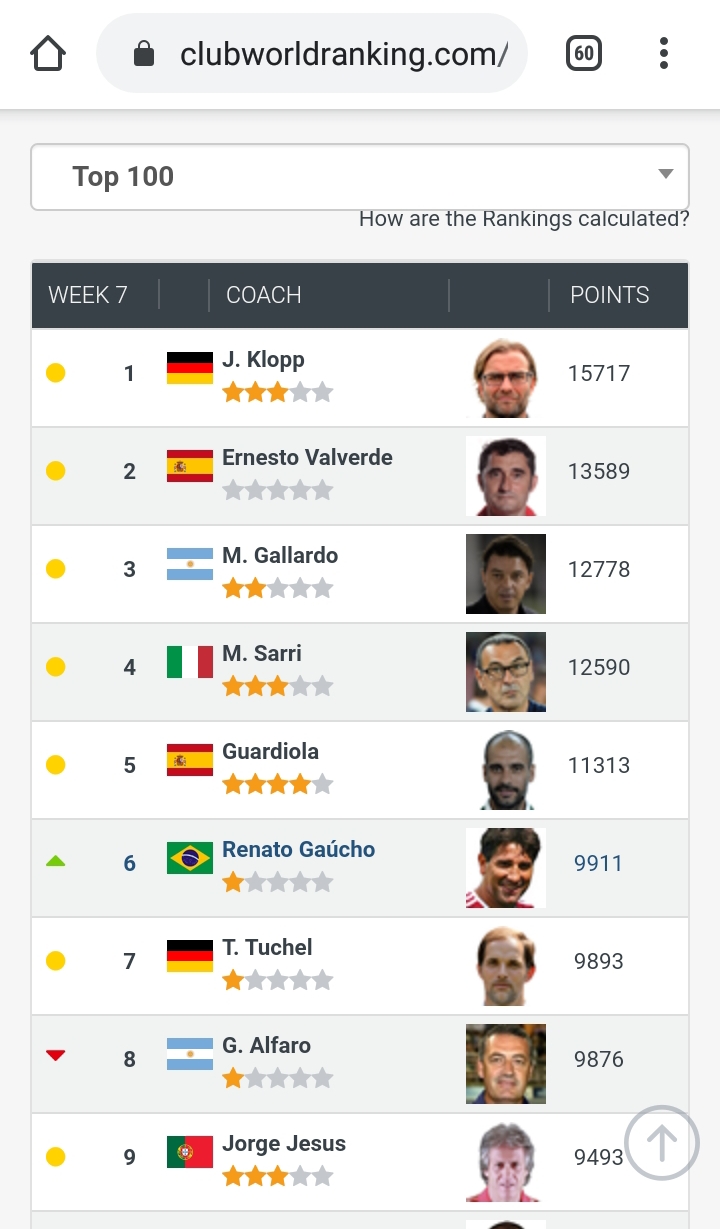 Es así, que el Muñeco se encuentra tercero por debajo del alemán Klopp, quien está primero  y del español Ernesto Valverde en segundo lugar. Además, se para por encima del italiano Sarri en cuarta posición y Guardiola en la quinta. De esta manera, si bien no ascendió en la lista, se mantiene en su posición desde hace varias semanas.