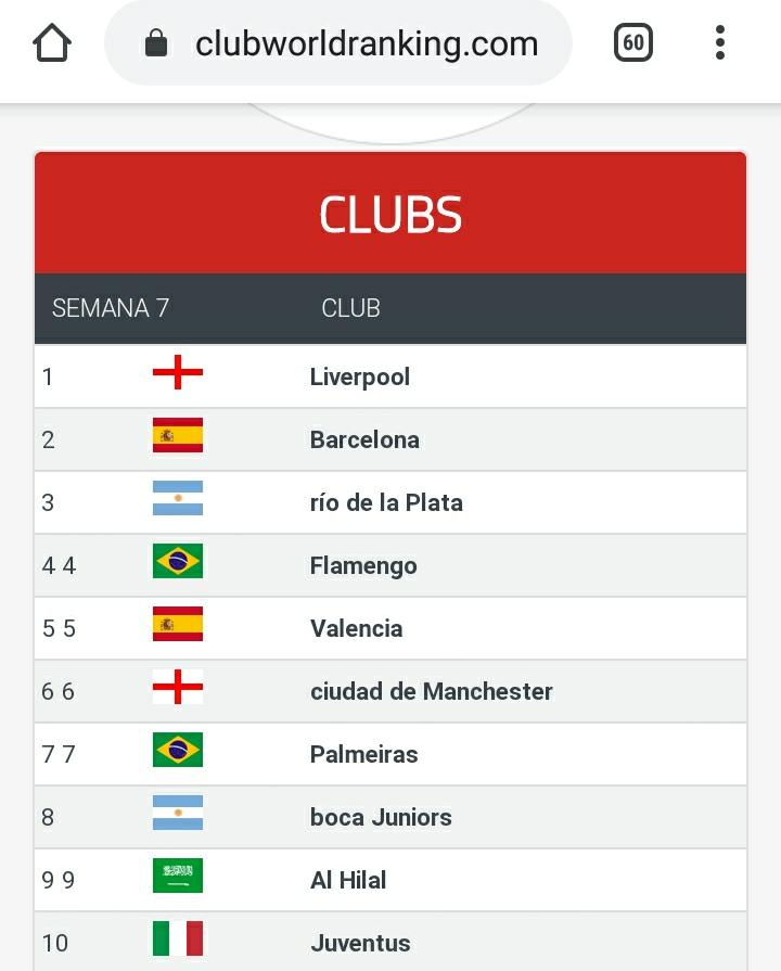 Mientras que el plantel Millonario, quien también está en tercera posición. Se para por debajo de Liverpool el primero, Barcelona quien se encuentra segundo. Mientras que por debajo de  los de Núñez, se paran Flamengo en cuarto lugar y Valencia en el quinto puesto. Al igual que el DT no ha avanzado pero si se ha quedado en su lugar.